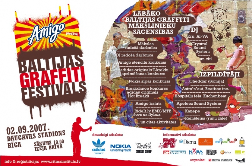 В этом году 2 сентября на стадионе Даугава уже во второй раз соберутся лучшие в Балтии художники граффити и их болельщики для того, чтоб в творческой атмосфере определить победителей фестиваля этого года. Amigo Балтийский фестиваль граффити пройдет в сотрудничестве с MTV Baltija, где и можно будет заглянуть во внутрь мероприятий фестиваля.
